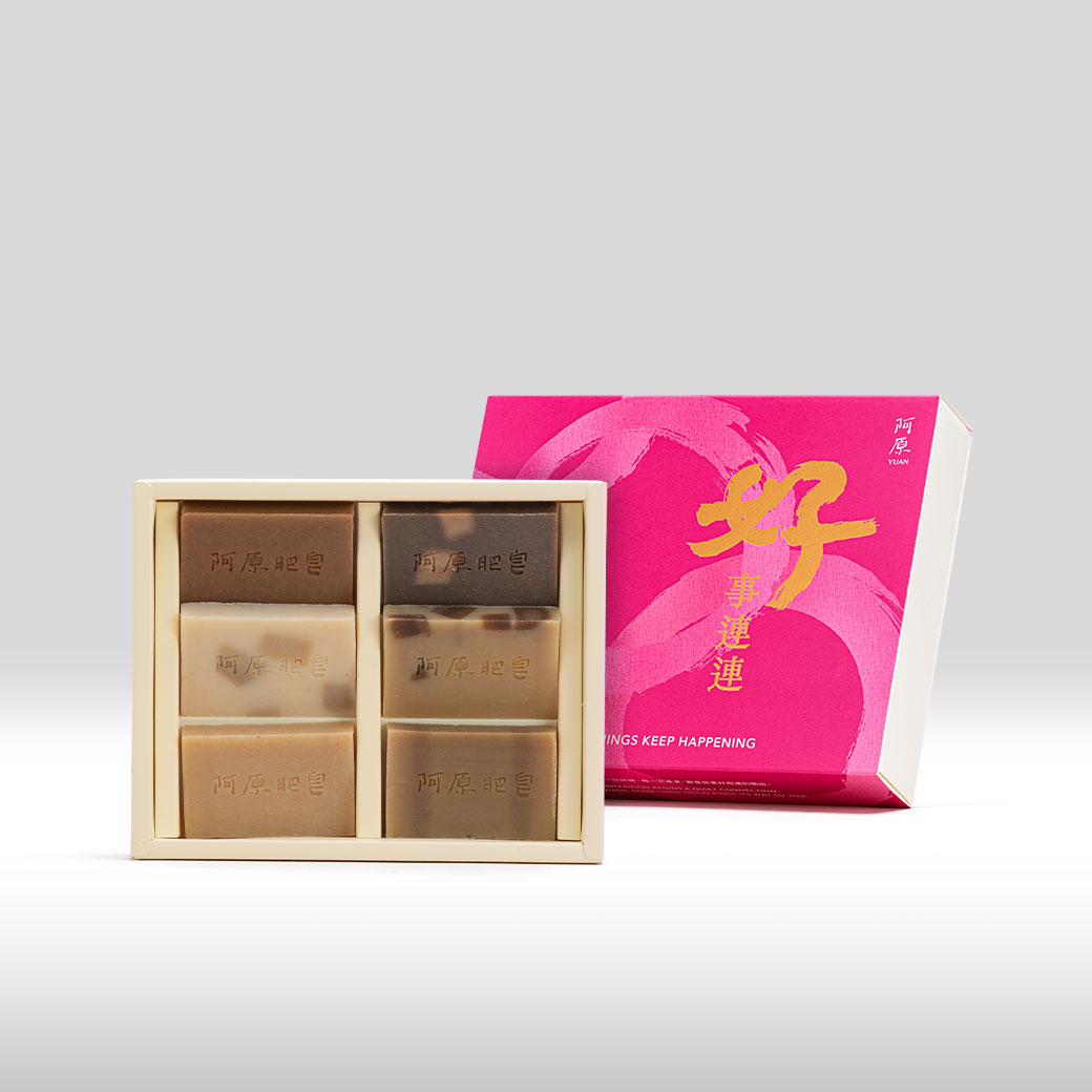 【阿原】結緣禮盒〈好事連連〉以職人手寫書法圓意搭配六款草本皂,承載祝福與手作溫度。