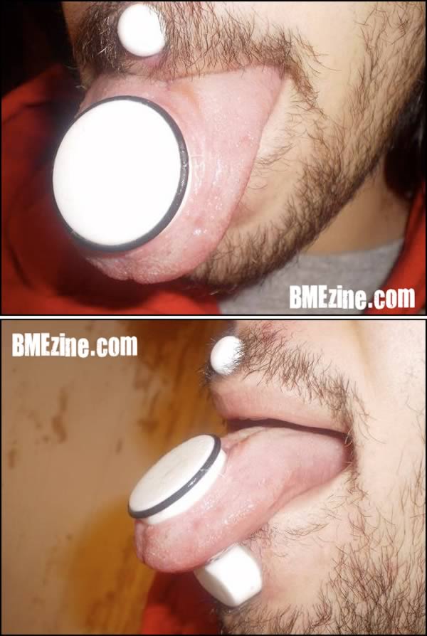 看完上面三項方法,看看這個簡直舒緩多了(好險不是把舌洞撐大),直徑長達30毫米的舌環,放入嘴巴真的是不可能的任務!人中上的卵形環的直徑也有11.5毫米。