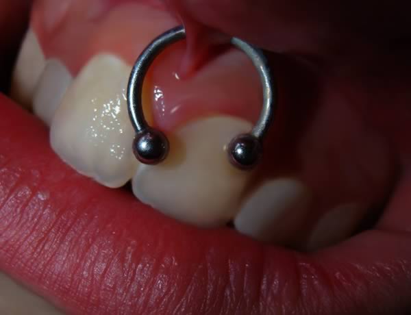 這種穿環方式統稱「微笑環」,因為只要裂嘴一笑,嘴內的環就會出來見客啦!同時它也很容易癒合,所以穿洞人士總是要想盡辦法抵擋這種體內的癒合能力。當然這也是要看人穿,因為嘴內的繫帶太短或是位置太高,可能就沒辦法穿嚕。