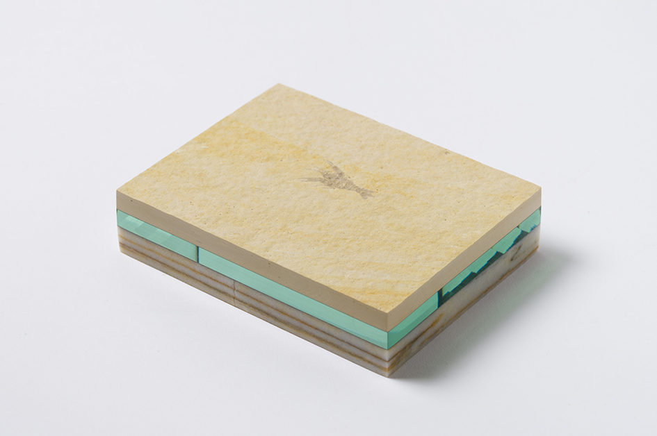 除了石頭外,TODO也用化石作為創作材料,像這個作品上的圖案就是蝦的化石。