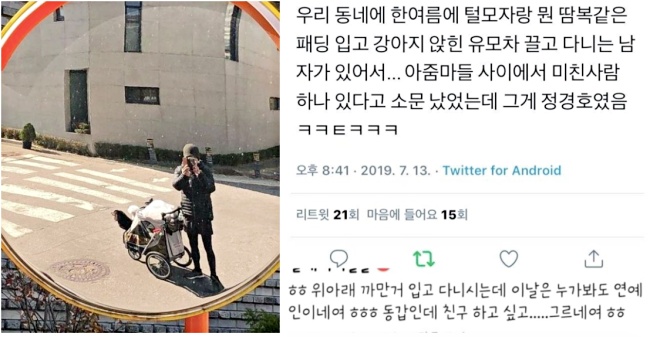 前陣子,韓網討論區就出現了多篇社區目擊文,許多民眾表示:「明明是大熱天,卻在住家附近看到一個穿著長袖長褲、羽絨外套,推著寵物推車散步的人」,超違和又詭異的裝扮,立刻被居民們鎖定成怪人,引起不小恐慌(?)…