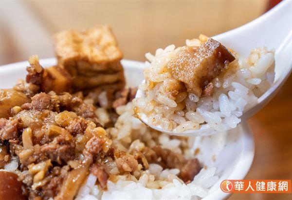 滷肉飯是典型高熱量、高脂肪、高鈉的食物,但是,肉燥與肉汁噴發出來的香氣,令許多人難以抗拒。使用肥肉料理成肉燥,雖然口感好、入口即化,但是其中的脂肪、熱量卻十分驚人。除了怕肥胖的人應該淺嘗即止,本身患有多囊卵巢症候群的女性,更應該適可而止。