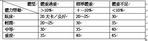 體重控制者──體型、體力勞動對照表:成年人每公斤體重所需熱量(大卡)