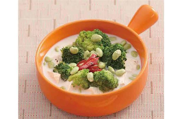 做法:所有食材洗淨,將青花椰菜切成小朵、毛豆汆燙,豆腐切成塊狀。鍋中注入1碗水,將所有食材放入,煮沸後再加黑胡椒、鹽調味即可。