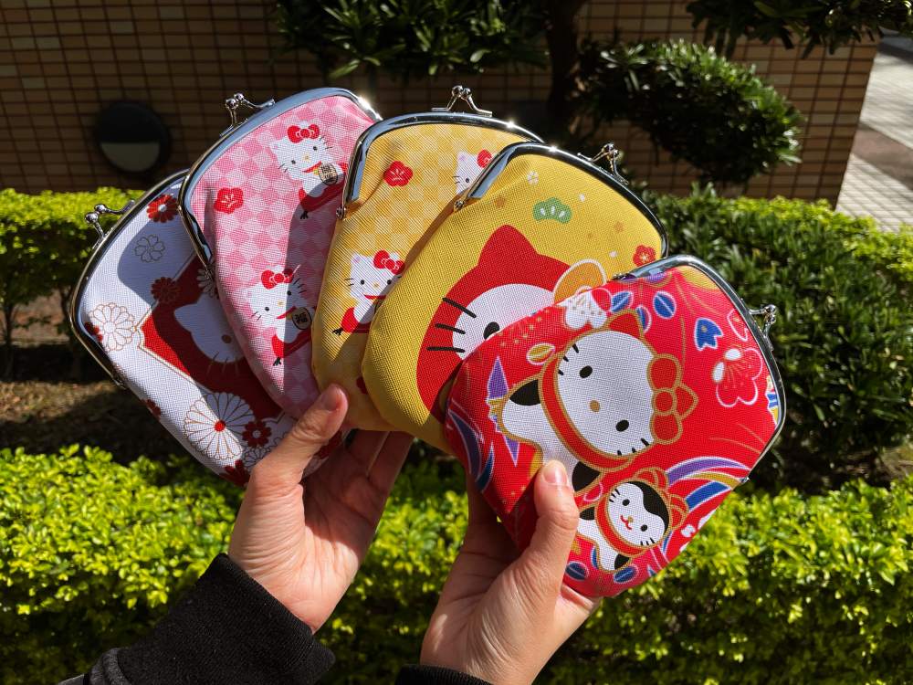 「Hello Kitty口金收納包」共推出開運、花開、招財、達摩與貓咪5款,以明黃、粉與鮮豔紅為主色,搭上日式和風新年開運主題,正反面為雙面圖案設計,材質防潑水,放零錢或個人小物都很合適,將於2月10日早上7點11分開放限量加購