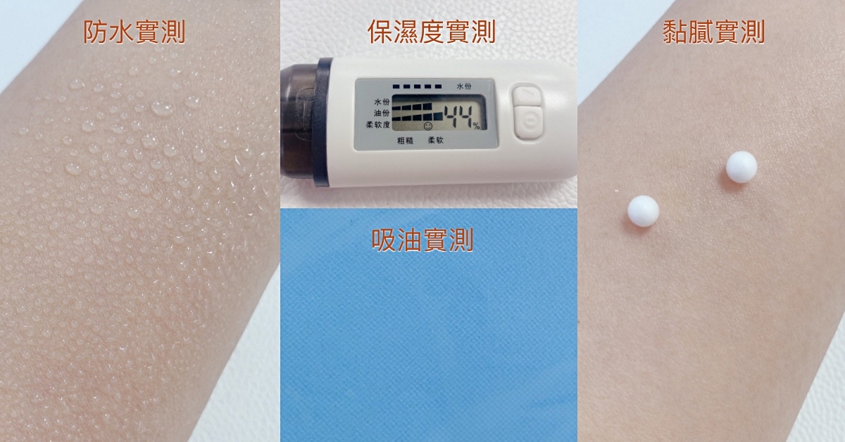 實測防水力很好!遇水的隔絕水珠也明顯,無融水現象。保濕度實測數值表現算有中高度的保濕力,保濕續航力不錯!吸油&黏膩實測結果也OK,吸收後不會有油膩或黏膩的感受!