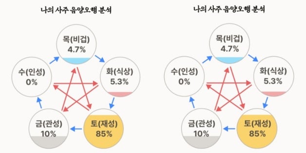 最後會有「五行生剋圖」,包含金(偏官、正官)、木(比肩、劫財)、水(偏印、正印)、火(食神、偏官)、土(偏財、正財),最外圈藍色是「生」、中間是「剋」!