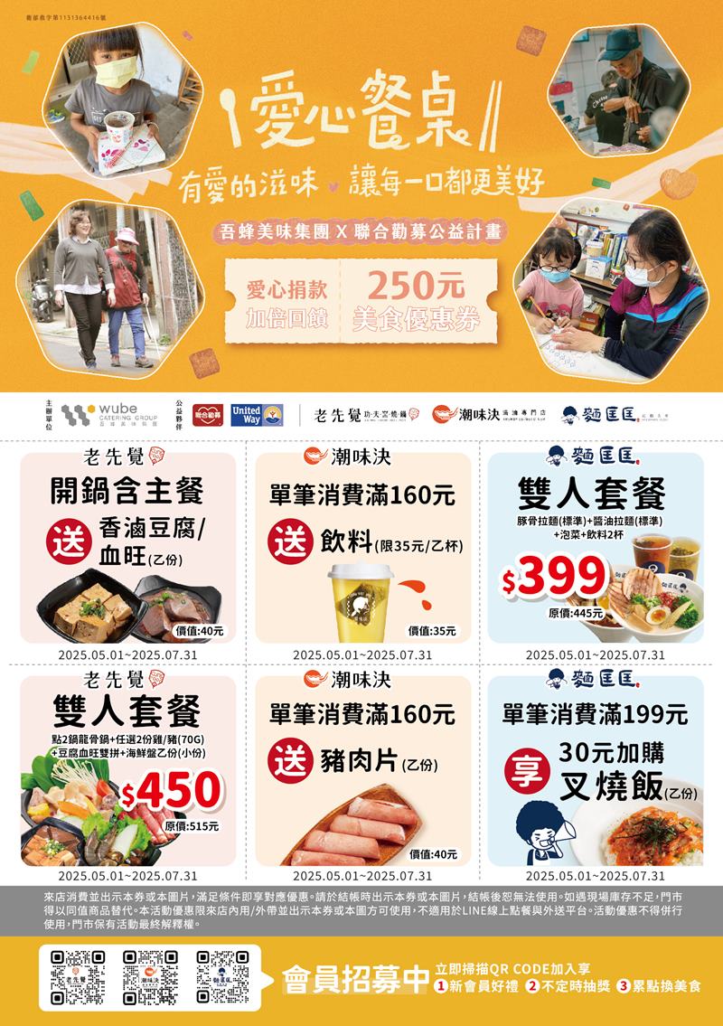 讓一頓餐食,不只是填飽肚子的日常,也能是一段被善意包圍的記憶。吾蜂美味集團宣布自5月1日起至6月30日止,將攜手聯合勸募啟動「愛心餐桌計畫」,透過LINE PAY捐款機制邀請全民響應,只要至全台老先覺、潮味決及麵匡匡任一門市捐款滿百元,即可獲得價值250元的品牌優惠券,以美食回饋您的善舉,將愛心化作一道道溫暖的滋味,幫助更多需要幫助的朋友一同享有「好好吃一頓飯」的權利。