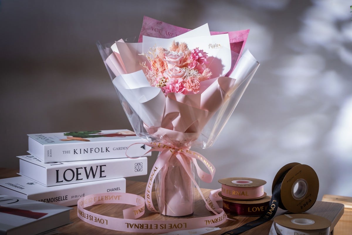 「代官山花苑」源自東京代官山,承襲日本花藝美學的靜謐精神,隱身於台北市大安區樂業街巷弄中,提供鮮花、永生花與客製花束等多元服務。其中,2680元的「嫣然|花霞永生玫瑰花束」最受歡迎,而3680元的「奢綻|夕凪 永生玫瑰花束」則充滿浪漫氛圍。
