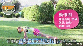 先做一個平板式撐地,用肚子的力量支撐,雙腳開合跳
