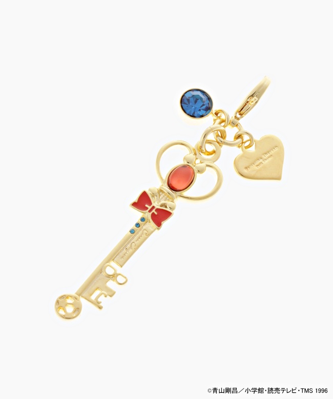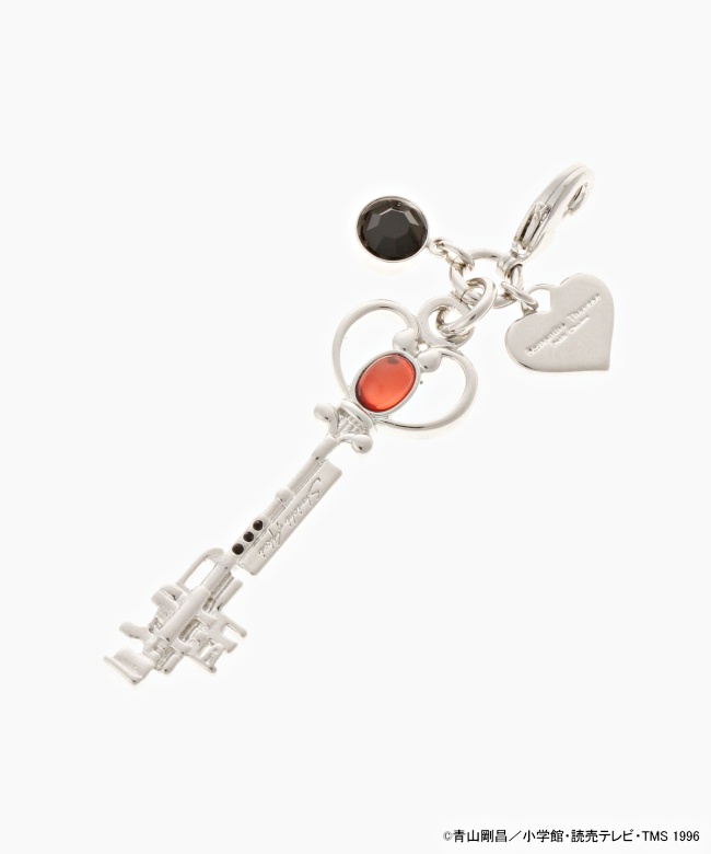 聯名皮夾、小包上鑲著金飾裝飾,上面除了有招牌蝴蝶結型變聲器,正中央還做成一個鑰匙孔的造型,同時附上象徵真相的鑰匙吊飾,吊飾上集結蝴蝶結型變聲器、犯人追蹤眼鏡以及足球,掛上就能解開包(皮夾)內的案件真相(笑)!