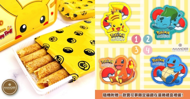「寶可夢原味蛋捲禮盒」黃金酥脆蛋捲帶有濃濃雞蛋香,恰到好處的煎焙蛋皮捲成一層層的金黃色蛋捲,精緻皮卡丘鐵盒、專屬提袋和限量造型磁鐵,每盒隨機附贈一款造型磁鐵,共四款,身為寶可夢迷絕對收藏的好禮!