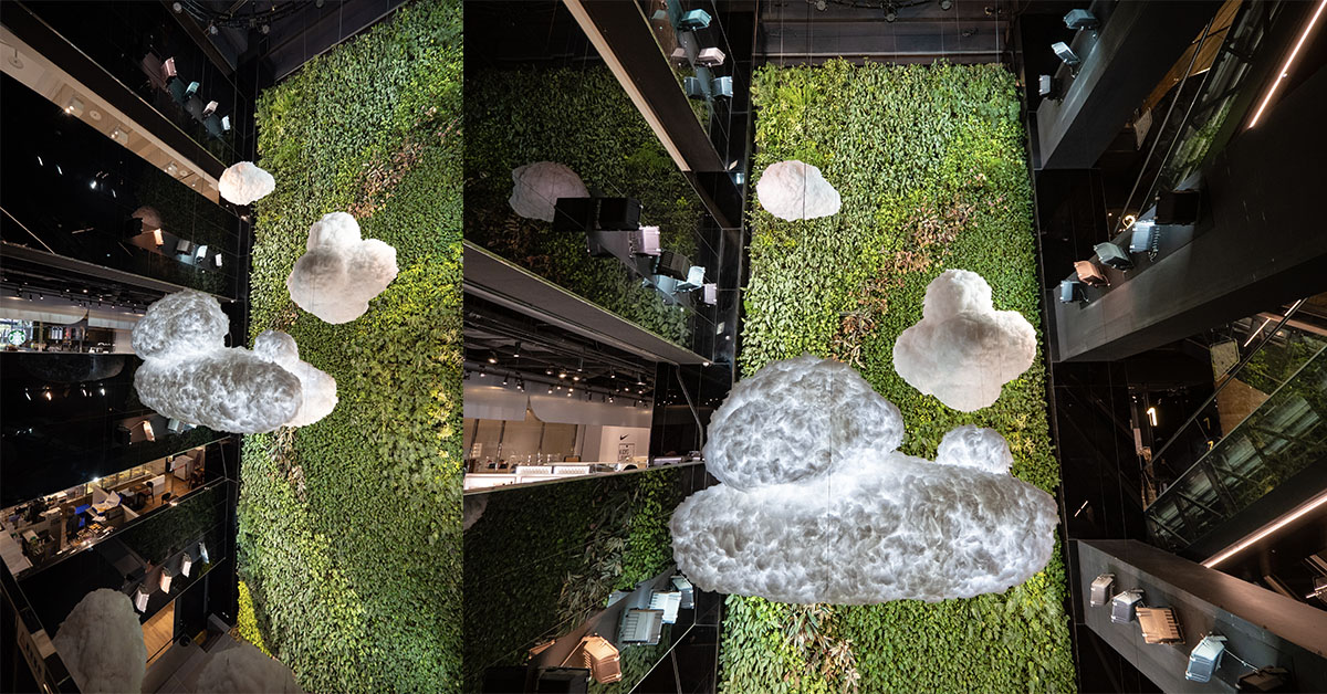 勤美誠品裡飄來了好幾朵軟綿綿的雲!隨時都是晴天的室內雲朵,搭配後方植生牆綠植,與不間斷的光影變化,帶給大家療癒舒心,又充滿想像力的拍照體驗。