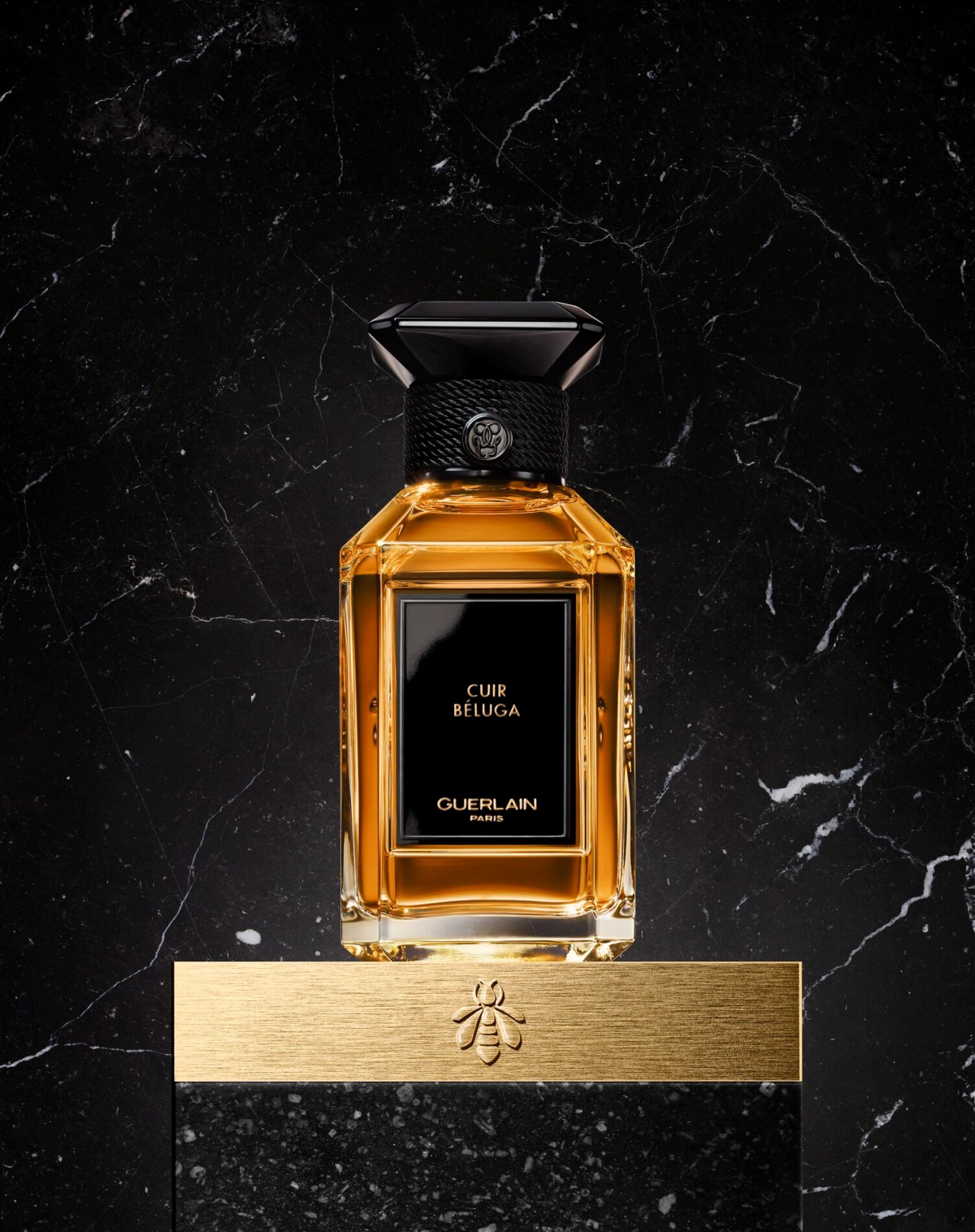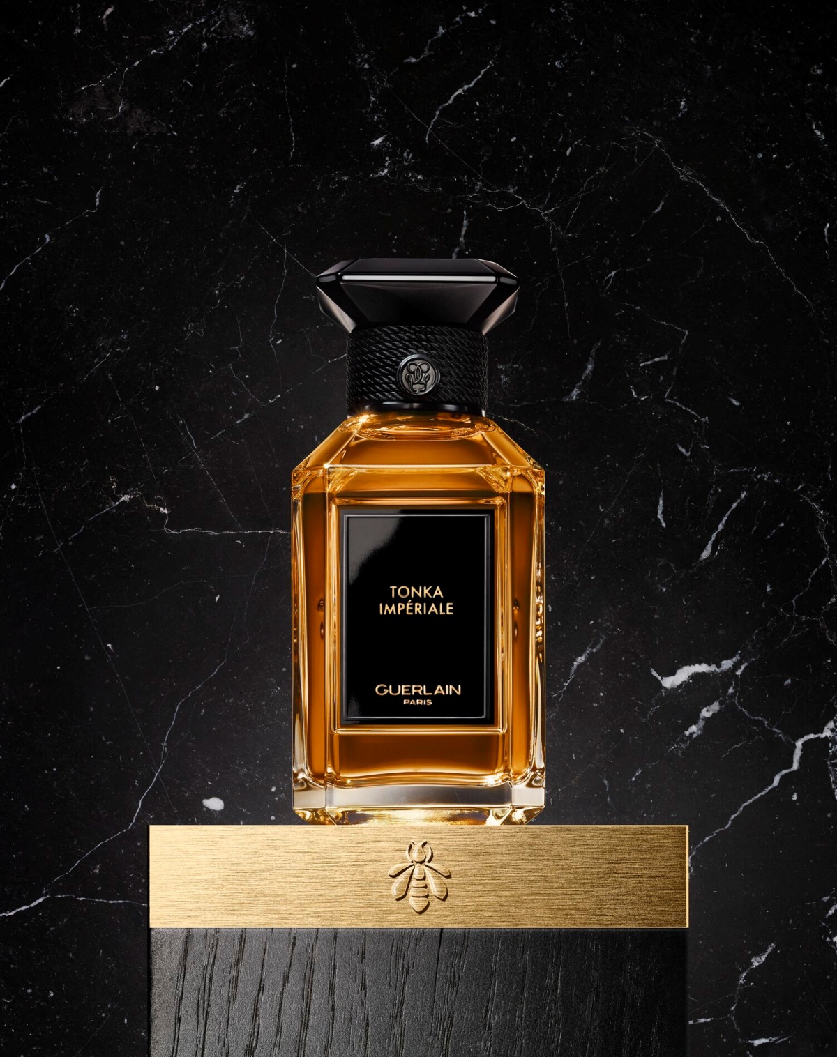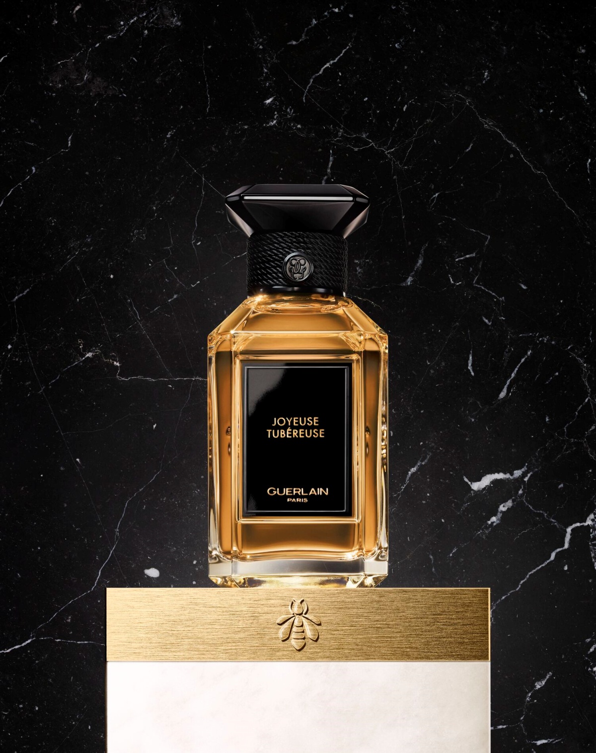 高踞在瓶肩上的一個晶亮的黑色瓶塞,頂部是一個八角形蓋面,上面飾有一塊刻著雙 G 標誌的金色平板。從正面看,瓶塞的形狀讓人聯想到傳統封瓶的曲線,繩釦則呼應了蠟封傳統。最後,瓶口裝飾著九條黑線編織而成的精緻飾邊,以歌頌嬌蘭極為重視的打結藝術。這三項鮮明的特色共同向嬌蘭女工藝師的專業技藝致敬。飾有優雅編織圖案的白色鐘形外盒上有著與香水瓶相同的黑色標籤,並為此特別印有嬌蘭的代表性封印–金色小蜜蜂。
