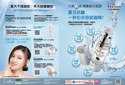 NewIcon引進正宗紐西蘭蜂毒保養品,為符合夏日抗皺保養品的清爽感,更開發一秒化水的清爽精華液劑型,顛覆國人對抗皺保養品油膩厚重的認知。「NewIcon蜂毒精華液」經塗抹後,立刻自凝膠化為水狀,不黏稠,不厚重,瞬間滲入皮膚表層,略微按摩後,可讓臉部皮膚有微刺及拉提的緊緻感,一次解決缺水與細紋兩大肌膚老化問題。