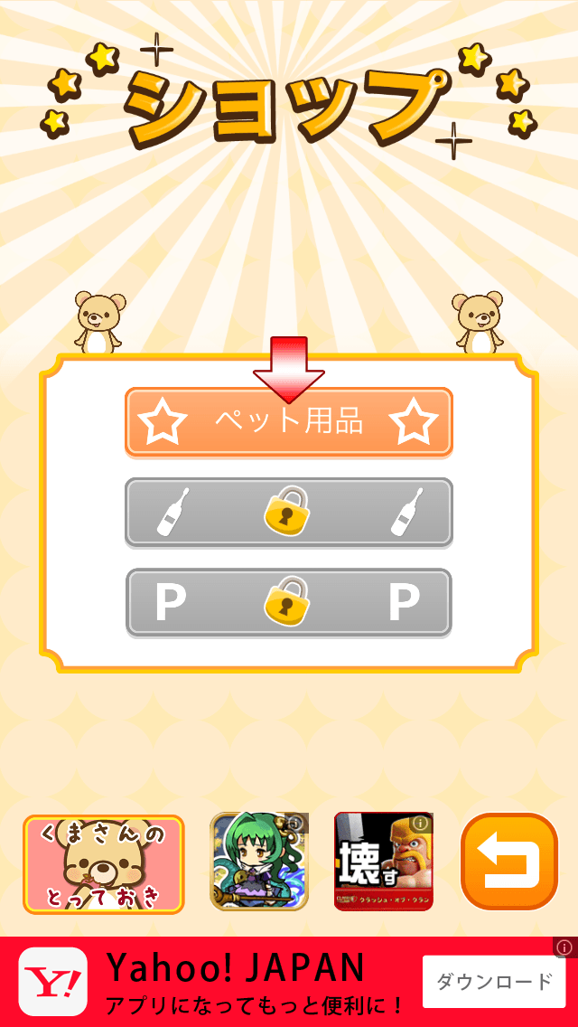 點選購物車,會來到購物區。共有三個選項,點選第一個「寵物用品」,來幫熊熊買東西吧!