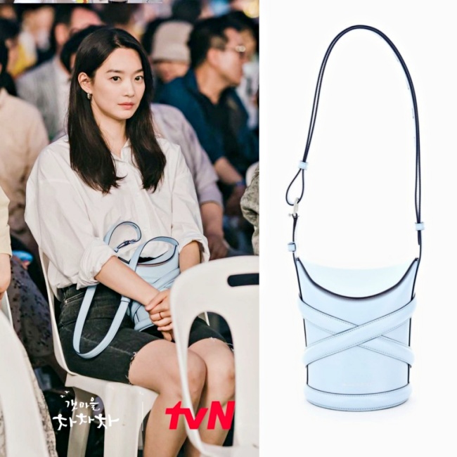 基本款白襯衫加上膝上短牛仔褲,一身休閒不失俐落時髦感的惠珍,是為了出席村內歌唱大賽,隨性穿搭的視覺亮點…就是這一顆Alexander McQueen的水藍色水桶包。