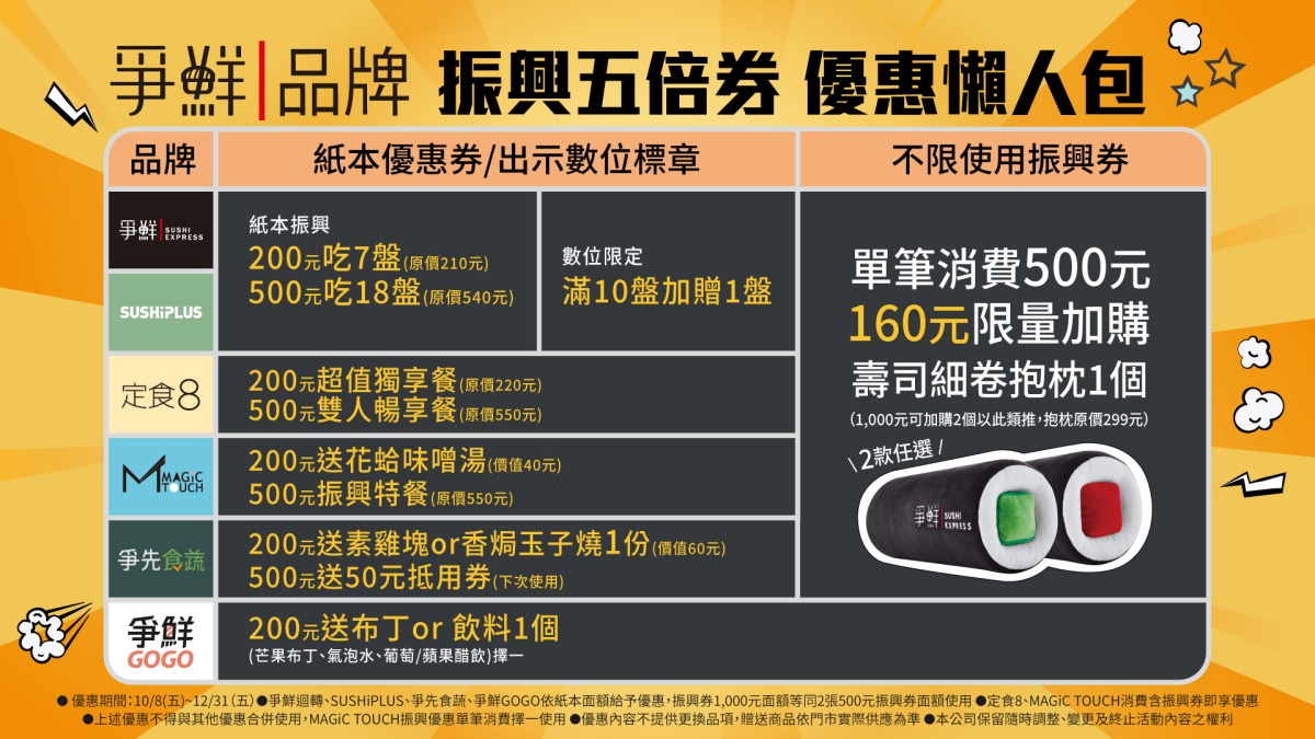 10月8日至12月31日,爭鮮旗下6個品牌,爭鮮迴轉壽司、sushiplus、定食8、Magic Touch点爭鮮、爭先食蔬、爭鮮GOGO依品牌推出多重限定優惠,分為200元與500元兩種方案(持紙本1000元消費則等同2張500元紙本面額活動使用),還可滿額加購限量細卷抱枕,不管是振興紙本券或手機出示數位標章皆通用!