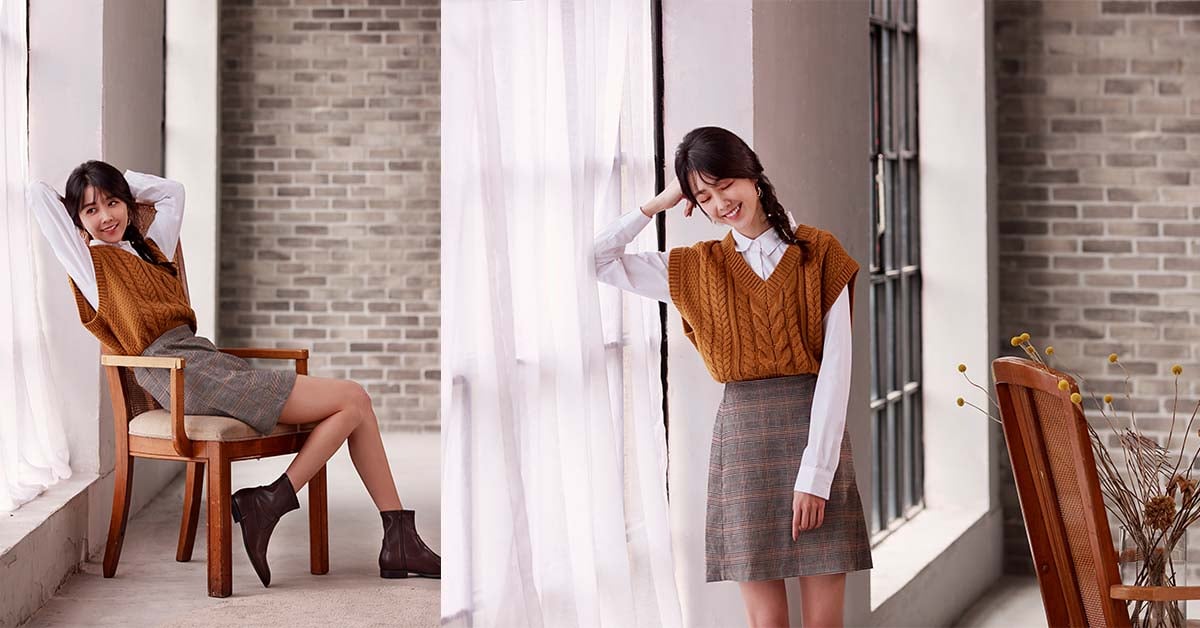 好感針織系列秉持著「For all」的品牌精神,推出不分年齡、所有日常場合都適合的百搭單品。「品牌好友」邵雨薇表示,平常選購衣物最在意的就是單品搭配的多元性,而「短版粗紡針織背心」以短版寬鬆設計加上粗紡麻花編織工法,不論內搭襯衫、連身裙或是白T,都能簡單有型,輕鬆為整體造型加分,絕對是今年秋冬必備單品之一。此外,V領融合落肩設計的小心機,不僅可以修飾臉型、使頸部線條更加纖細,更能夠縮小肩膀的視覺距離,拉長整體身形比例。邵雨薇本次也運用了經典白襯衫外搭褐色的「短版粗紡針織背心」,搭配膝上格紋短裙以及黑色平底靴,讓身形更加修長,展現氣質甜美的零失誤好感穿搭。