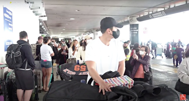 我們的迫降CP、彬珍夫妻在稍早抵達LA啦!小倆口一下飛機立刻被當地大批粉絲包圍,孫藝珍還開放粉絲合照,現場宛如粉絲見面會,但是由於人真的太多,可以看到本來是孫藝珍走在前面、與玄彬一前一後推著行李走進出境大廳,在手扶梯時,孫藝珍疑似卡了一下,這時男神馬上發現不對「回頭關心老婆的狀況」,外加一個箭步去解救他「幫忙推行李車」,之後短短路途之內,頻頻回頭確認高達6次。