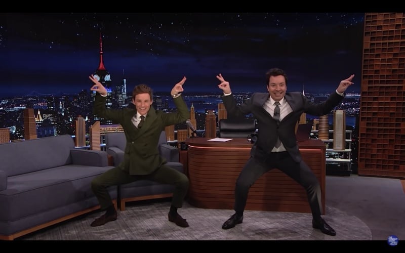 在電影中飾演紐特的艾迪瑞德曼在《吉米 A 咖秀》,在第一集中為了抓住發情的「大犀牛」爆角怪,而模仿母犀牛的外型,所以在訪問的最後,艾迪瑞德曼直接起身,親自指導主持人Jimmy Fallon如何變身「人面蠍尾獅」,只見他拉拉褲管後,直接雙手舉高深蹲,讓主持人也不禁失笑!