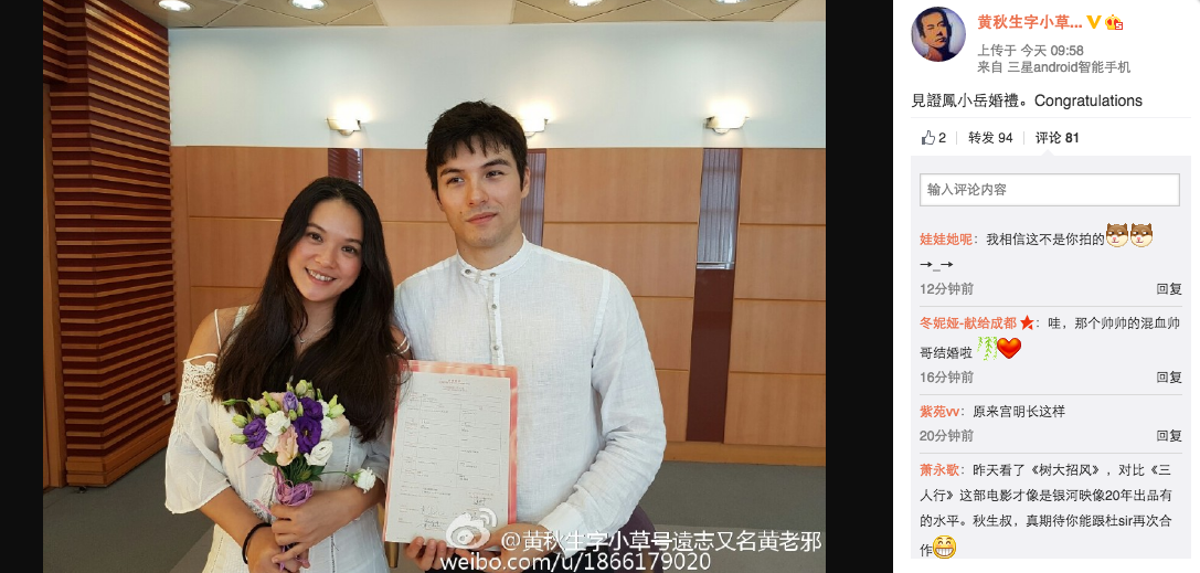 原本鳳小岳並不在乎結婚形式,但因為孩子已經出生需要報戶口,再加上他台英混血的身份持有英國護照,還要辦一大堆手續才能申報戶口,於是選擇先在香港公證再回台灣補登記。網友也紛紛湧入微博祝福:「好可愛的夫妻!」「本来就好幸福,有黄先生的見證就更更幸福了」,也有粉絲崩潰表示:「啊啊啊啊我的宮銘啊啊啊啊」,總之不管粉絲反應如何,都先恭喜我們鳳小岳新婚快樂啊~~