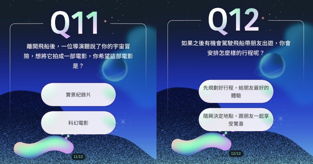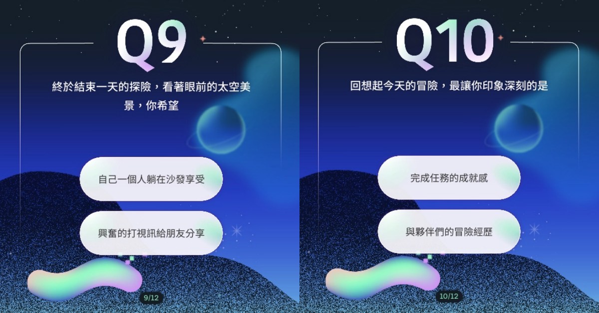 當飛船慢慢駛向未知的宇宙,妞妞們最興奮期待看到什麼景色呢?第5題開始我們在宇宙中將會碰到一連串的選擇,先完成哪種任務?碰到陌生的電波訊號該回應嗎?(本來想按下馬上接收,但想到「黑暗森林法則」又收手XDD)