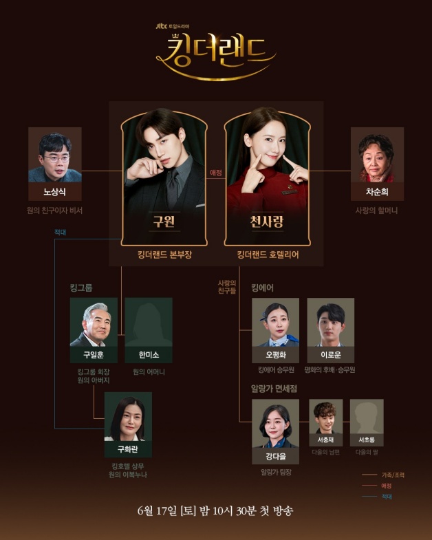 以具元和天嗣朗為故事主角,兩人之間有火花四射的感情線,在他們下方的就是具元的媽媽「鄭微笑」,具元身邊有父親、同父異母的姊姊、唯一的朋友秘書;天嗣朗雖然家人只有奶奶,但她有兩個好朋友「吳平和」和「強多乙」,有趣的是三個人都在王者集團上班!(笑)