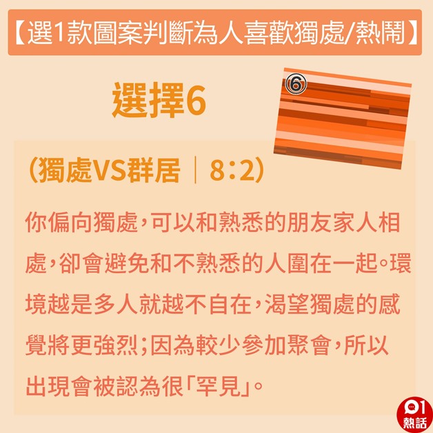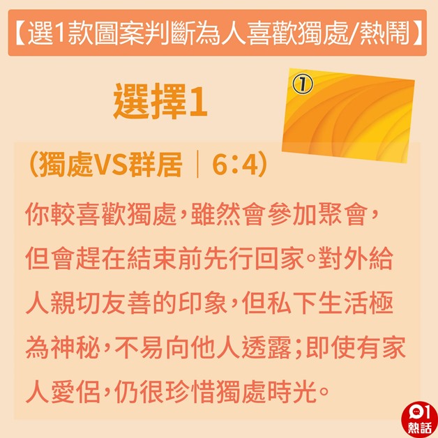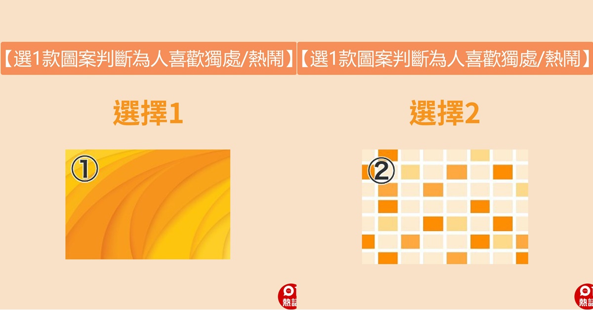 在繁忙的生活中,無論喜歡享受獨處時光還是群體活動,最重要是找到方法釋放壓力!日本網站《Curazy》較早前就分享一項心理測驗,只需從下圖6種橙色圖案中,憑直覺選出其中1款,便能測試你到底喜歡獨自一人或是團體活動。想知自己屬於孤獨或愛熱鬧型,不妨試做以下的測驗吧!