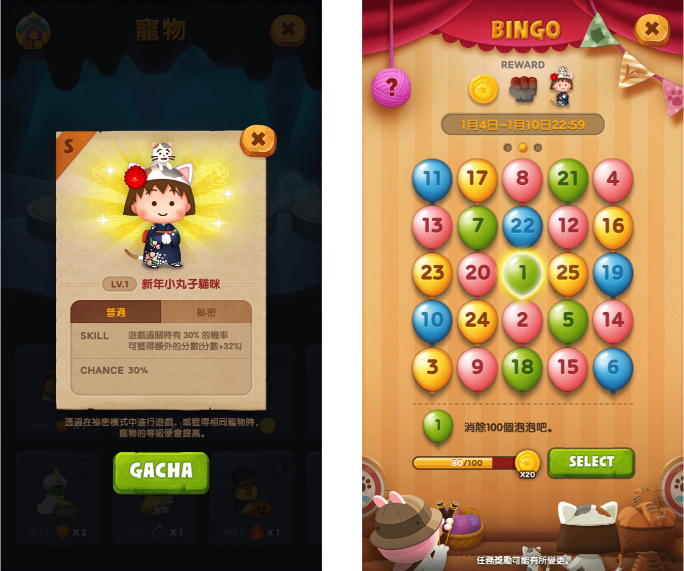 而且這次的合作不只可愛的插圖,只要完成任務就可以得到限時的貼圖和寵物扭蛋,首先只要完成25個氣球所有指定的任務,就能獲得合作限定寵物「新年小丸子貓咪」完全就是萌值破表,超級可愛!