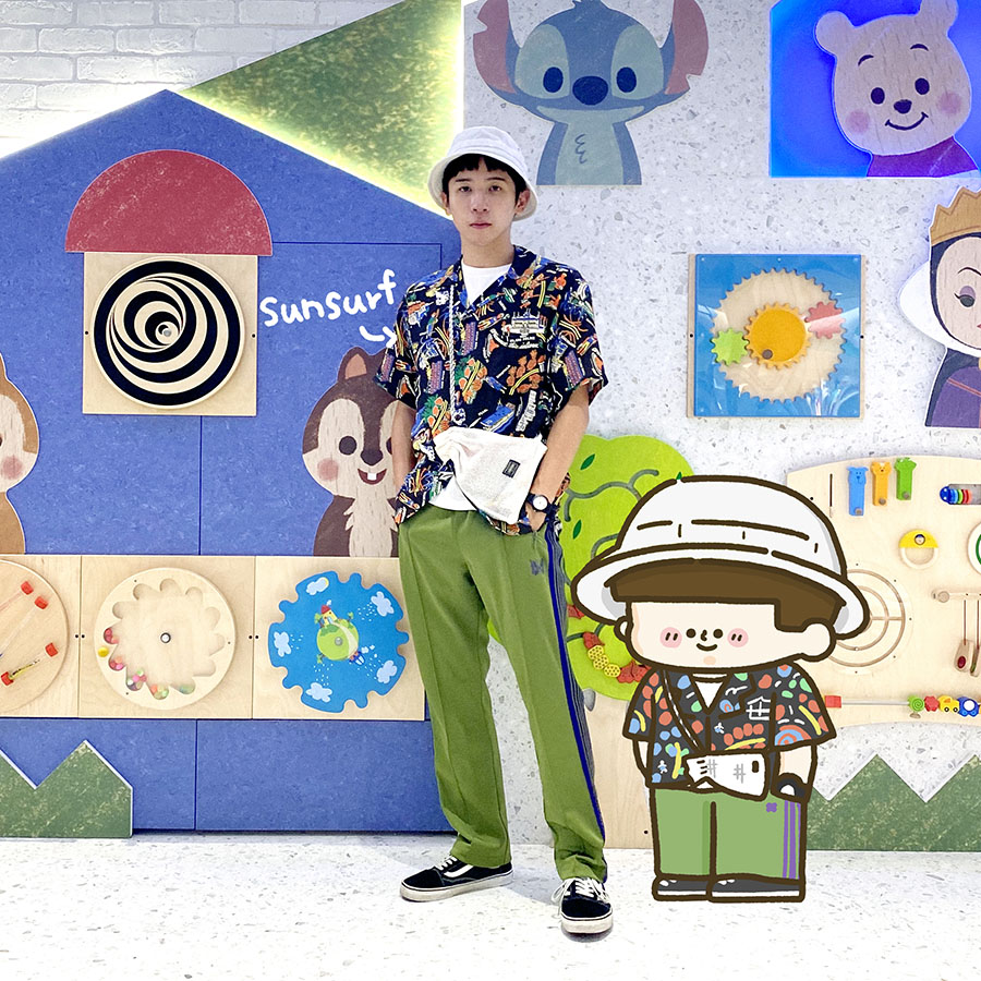 沒辦法去夏威夷就只好穿夏威夷衫過過乾癮吧~開領的襯衫內襯簡單的白TEE,配件隨行小包及帽子也用同樣是白色系的單品,下半身搭配和襯衫跳色的綠色運動褲,運用異材質的搭配,讓整體穿搭讓看起來更豐富且有層次感。