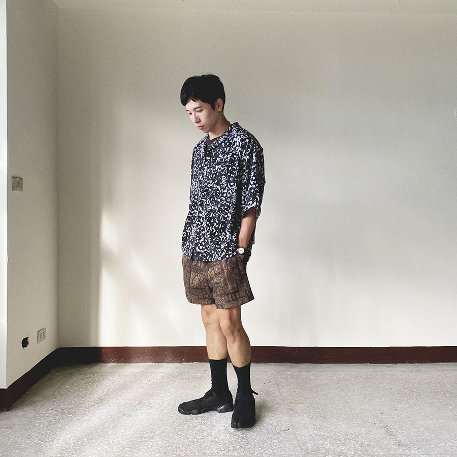 如果想要一點奢華感,就來一點動物紋吧!豹紋襯衫搭配變形蟲短褲,用兩件都是複雜花紋的單品,混搭出一種自己的風格。或許有人會擔心複雜的花紋會造成視覺上過於凌亂的問題,但因為全身都是深色系,即使花紋複雜,透過顏色也能找到一個平衡。