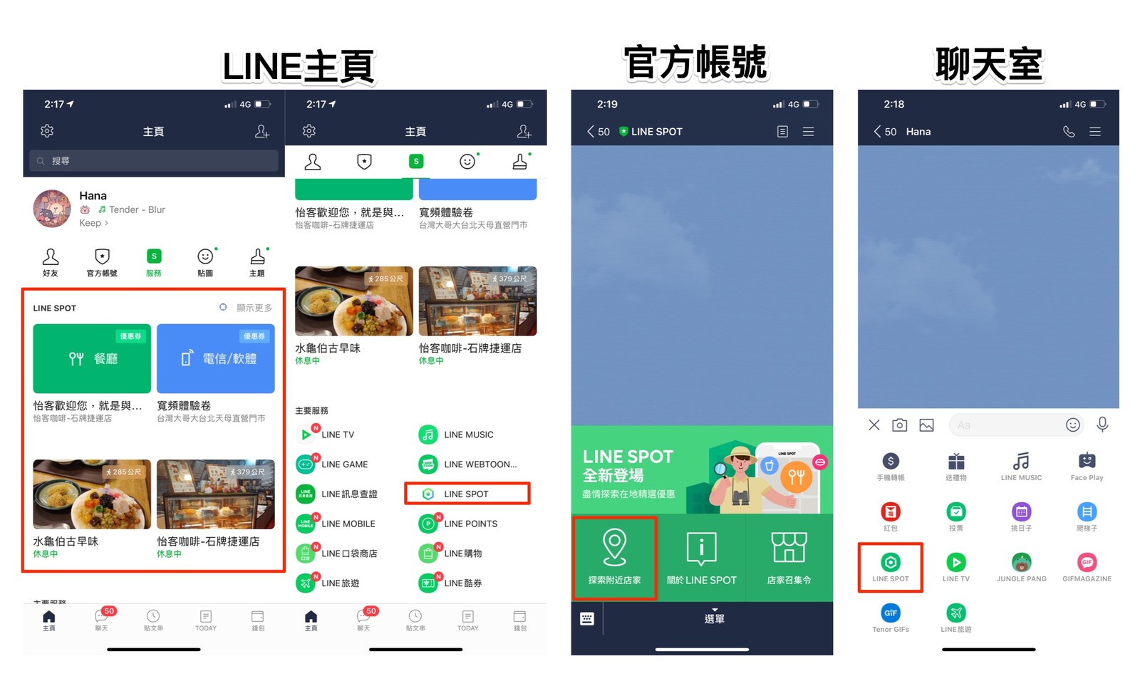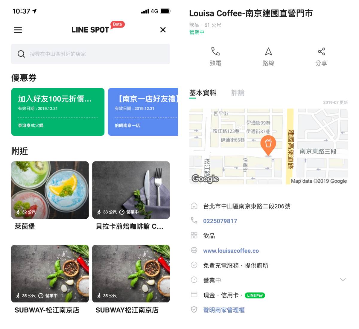 LINE SPOT可說是「商家搜尋神器」,將附近的店家一次收錄在這個平台內。從LINE主頁、官方帳號或聊天室等位置進入LINE SPOT之後,就可以開始探索囉!LINE SPOT提供了附近店家的資訊(餐廳、藥妝店等)與優惠券,讓你輕鬆得知附近店家與你的距離、聯絡電話以及他們提供的服務。出門在外若想臨時探索附近的餐廳,用LINE就行。