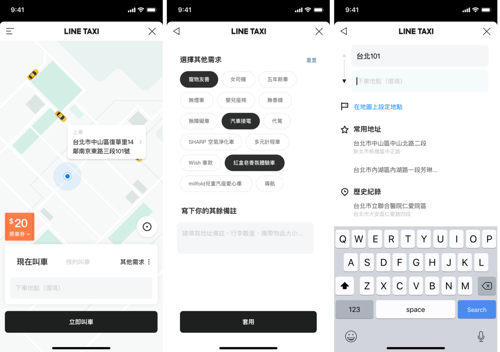 可從LINE服務頁面或LINE TAXI的官方帳號進行即時或預約叫車,在叫車時還可填入個人需求與備註。手機小姐覺得很方便的是,需求有「寵物友善」這一項,如此一來就不怕車來了司機不給上車!