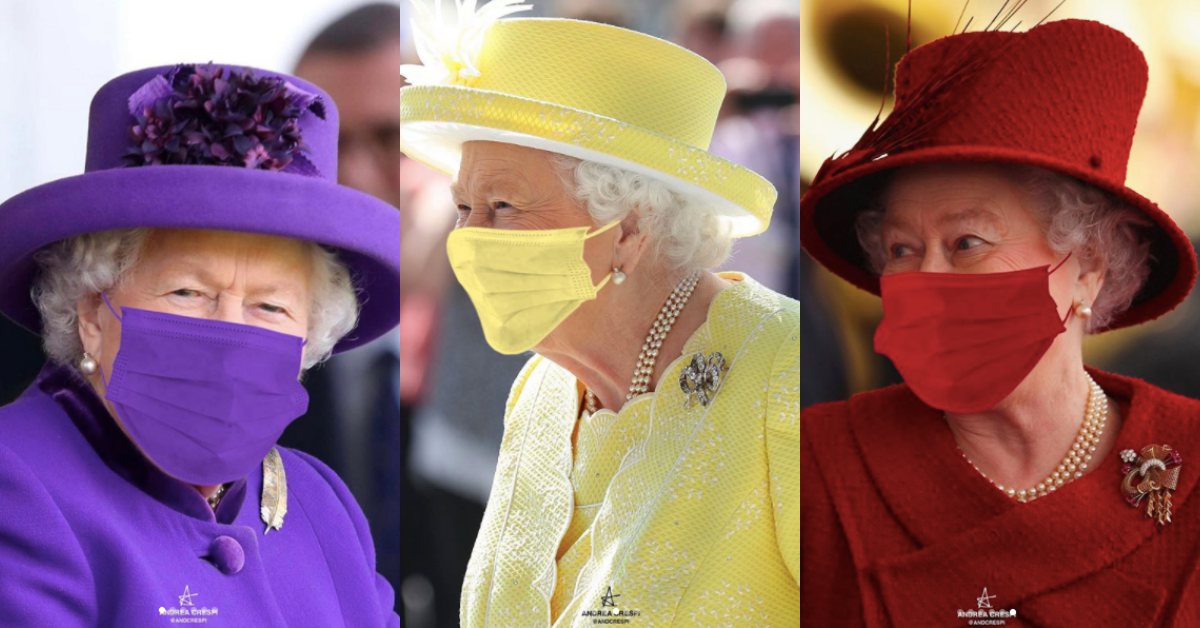 原來這是一位義大利藝術家Andrea Cerspi的創作,他為女王做了一系列的同色系口罩穿搭,也為現在大家正在面對的嚴峻疫情與居家隔離生活,添加了一些幽默可愛的氣氛!(女王真的豪可愛呀~~)