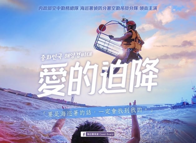 「你是否相信,有一種緣分叫命中注定?」由內政部空中勤務總隊海巡署偵防分署空勤吊掛分隊主演的「愛的迫降」,小標「要是海巡署的話,一定會找到我的」,並告訴觀眾海上不像陸地,一旦發生意外,四周都是不見邊際的海面,如同女主角迫降到陌生的國度,力不從心且孤獨無援,但請放心,只要一個信號,空勤吊掛分隊就會以最快的速度前往救援,絕不丟下面對困境、身陷危險的你!(韓文劇名寫著「中華民國海巡署」,太有心)