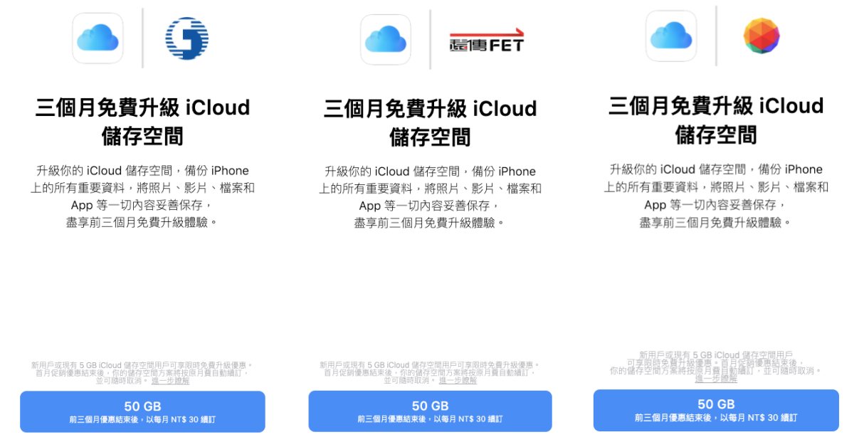 iCloud基本提供每人5GB的免費容量,可用來備份照片、文件與聯絡人等資料,讓使用者即使不慎遺失裝置,也能透過iCloud回復原有的資料。此次Apple與台灣大哥大、中華電信與遠傳合作,只要妞妞擁有台灣Apple ID帳號、沒有付費訂閱過iCloud,即可用代碼在App Store兌換50GB方案,免費體驗3個月,藉此評估自己是否真的需要多買空間。