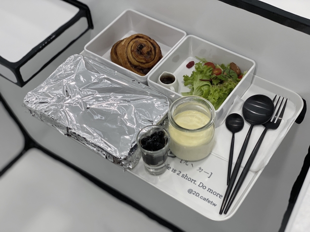 另外除了2D Cafe原先的招牌飲品之外,台北101店還會有搭配飛機主題的「飛機餐」,每日限定,共有兩種不同的口味供大家選擇,鋁箔包裝和擺盤設計跟在飛機用餐一樣,另外還有像是佛卡夏三明治、貝果等輕食,當然也可以加價升等為「套餐」,內含油醋堅果沙拉和鮮濃珍珠奶酪呢!