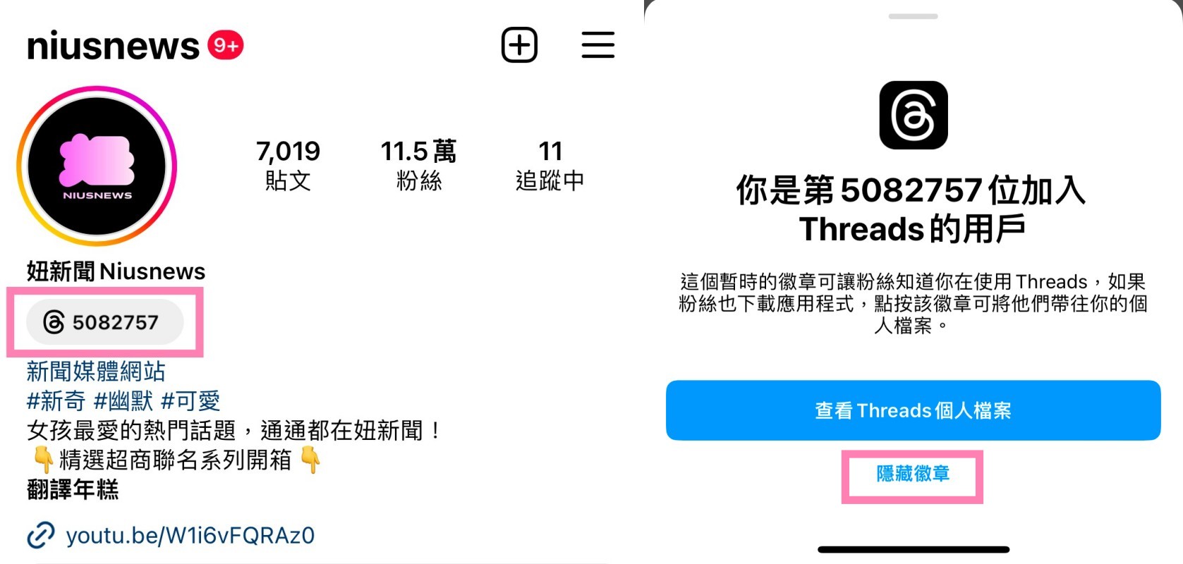 Btw如果妞妞們不想要Threads的徽章(連結)顯示在IG個人檔案頁面,只要長按就會出現「隱藏徽章」按鈕,點一下就可以隱藏囉!但目前移除徽章後就無法再次加回來,妞妞們按下隱藏前要三思(也或許未來會更改設定~)。