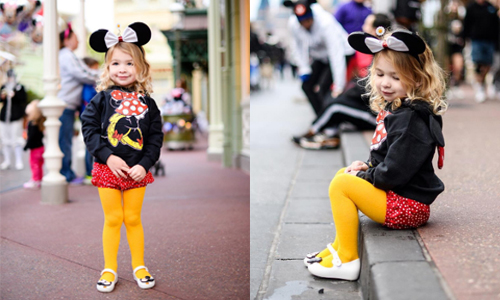 Lyla的爸媽好像是迪士尼的大粉絲,因為常常可以看到Lyla去迪士尼樂園時的特色穿搭。充滿白色點點的紅色燈籠褲、黃色褲襪還有白色厚底娃娃鞋,Lyla就是一隻小小米妮~