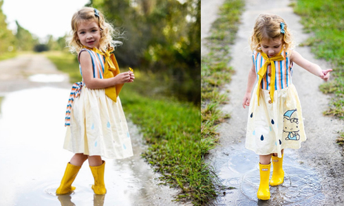 就算是陰雨綿綿的天氣,穿搭也不會偷懶!小洋裝外繫上小領巾為造型加分,就連黃色雨鞋都變得好時尚,即便是下雨天Lyla也可以成為街上的焦點。
