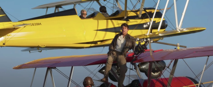 影片一開頭就可以看到阿湯哥蹲坐在一台紅色飛機上,身上沒有任何的安全措施,隨著鏡頭的拉遠更可以看到阿湯哥身後除了機翼之外只有一整片的天空與壯闊的峽谷,影片中更伴隨著高速風切過的呼呼聲,而站在紅色小飛機上的阿湯哥對著鏡頭帥氣一笑跟大家打招呼,並為了飛行中的噪音致歉。