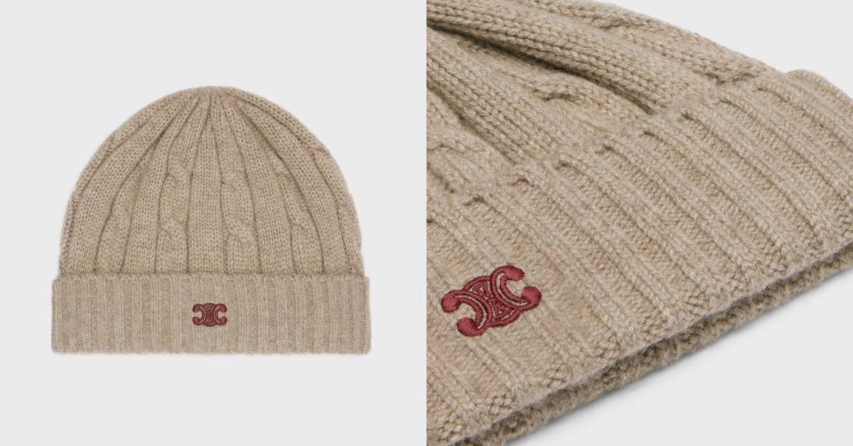 CELINE今年秋冬走「靜奢極簡風」,精緻的酒紅色TRIOMPHE刺繡搭配麻花針織的外型既溫柔又甜美,含91%羊絨在寒冷的冬天戴上它馬上暖活起來!搭配淺色針織洋裝或牛仔褲都很鄰家日常。