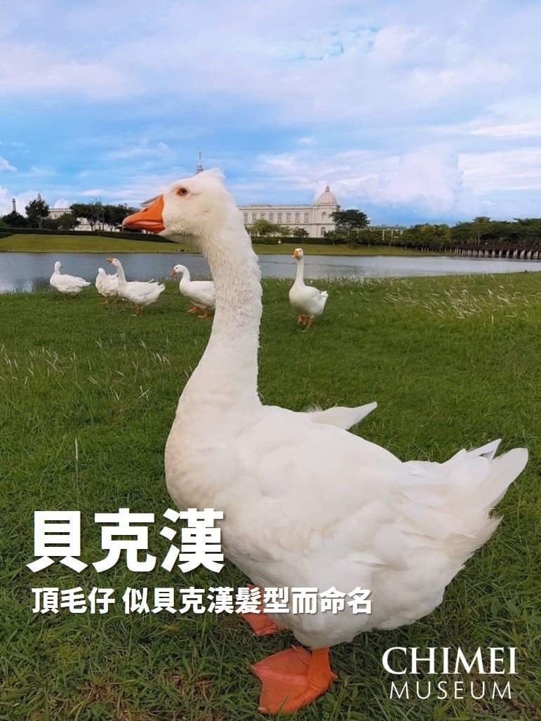 「貝克漢」曾是奇美博物館前任鵝王,後來被 Google 擠下王位,但依舊是園區內的元老級鵝鵝。大家曾一度分辨不出貝克漢的性別,直到 2022 小鵝「米雪兒」誕生,大家才發現米雪兒疑似是母鵝「芸芸」與貝克漢的小孩,因此判定他為雄性!