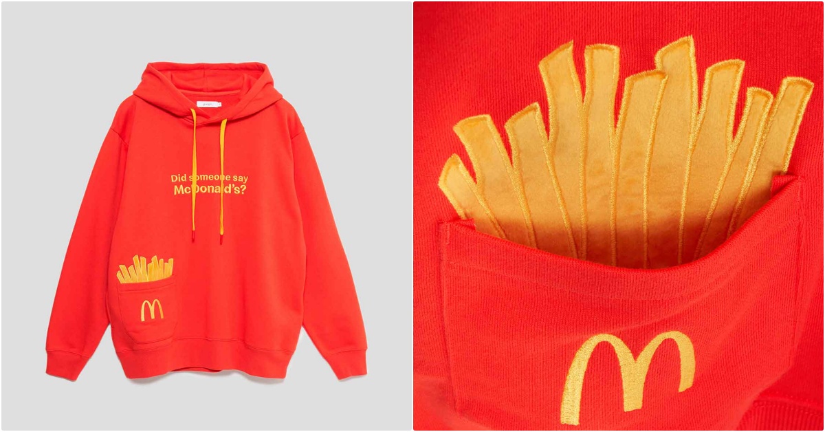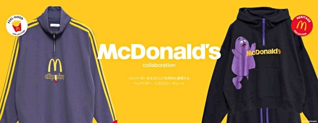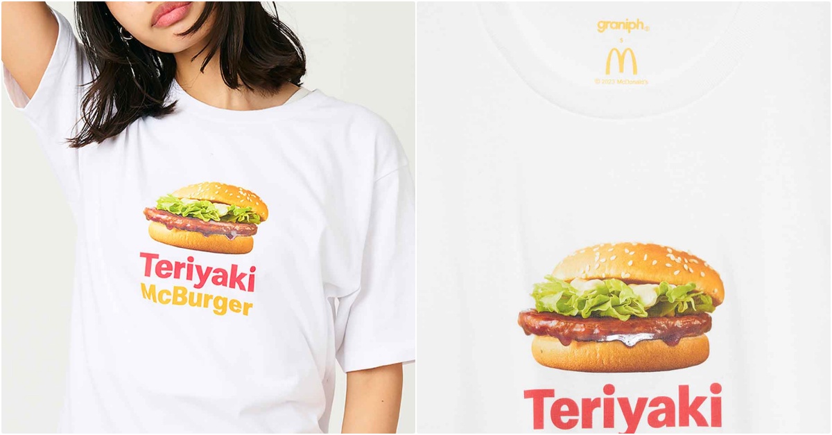 另一件大紅色連帽上衣,其實是來自「裝薯條的紅色紙盒」的選色靈感,整盒薯條也真的還原成「立體口袋」,同時幽默印上「Did someone say McDonald's?」標語,想配漢堡也可以!聯名白TEE上裝飾著整份日本限定的照燒漢堡,看著看著忍不住餓了…