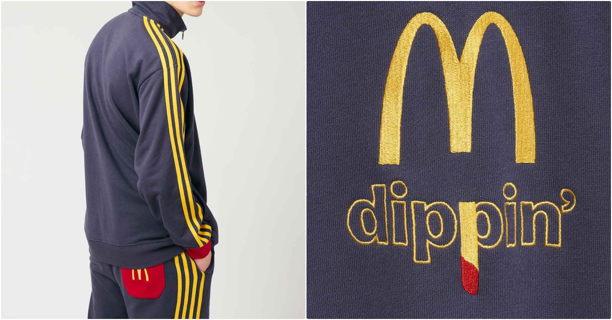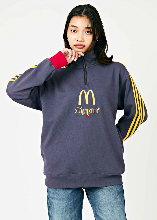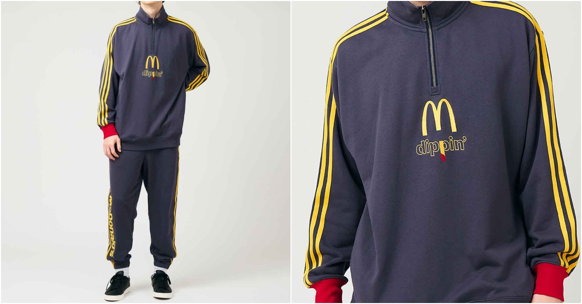 Oops~衣服沾到番茄醬了!印有「dippin(沾醬)」字樣的紫色休閒套裝,字母p上面變成「沾著番茄醬的薯條」,衣服以及褲子側邊的黃色線條、延升到袖口的紅色撞色也是呼應薯條沾醬的設計,長褲後的口袋還裝飾麥當勞的M標誌,薯條控必收整套去狂嗑大薯!!!