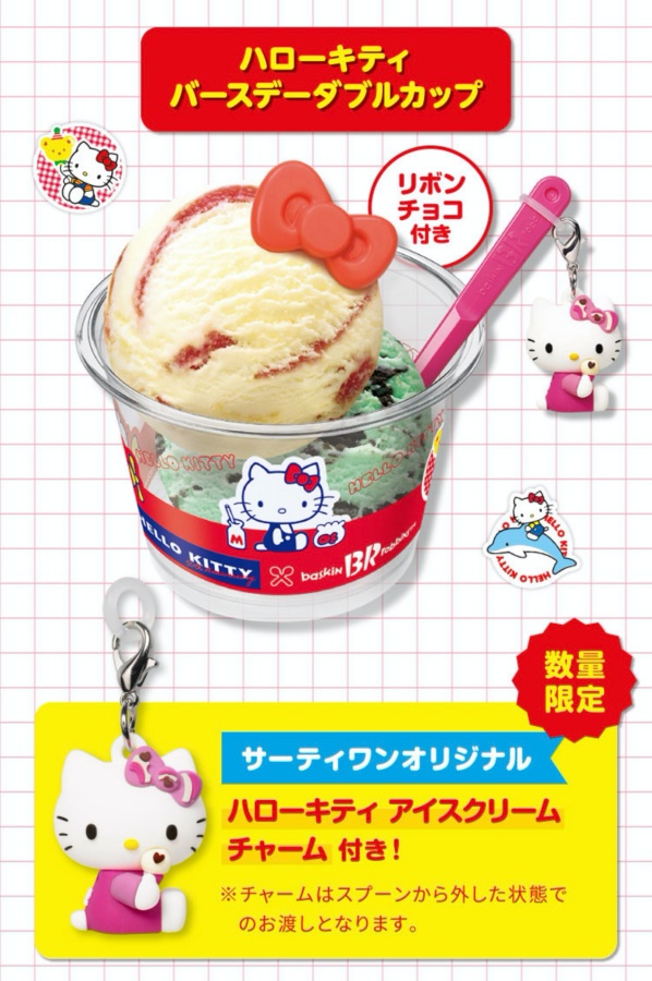 特別打造的「生日雙球杯」不僅可以任選2球喜愛的冰淇淋口味,冰淇淋上方還添加了 Hello Kitty 象徵性的紅色蝴蝶結巧克力。採用1974年代設計為中心的杯身,散發出十足的懷舊氛圍。同時,生日雙球杯還將附贈靈感源自「LOVE POTION」口味冰淇淋的限量 Kitty 吊飾!