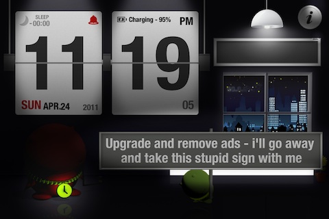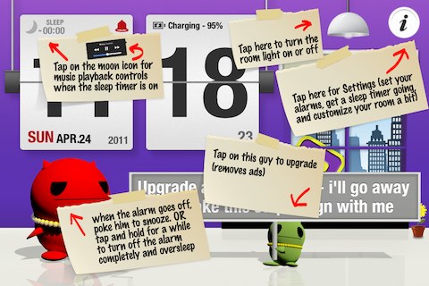 所有設定結束後,你就可以安心的睡覺啦!把iphone放在床頭當時鐘!燈光太亮可是會影響睡眠的,點一下右上方的電燈,把燈關上,小怪獸也會跟你一起進入夢鄉,再點一下畫面,燈就會開了!