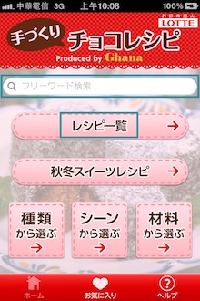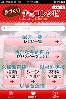 進入首先是一張美美巧克力實品照片,這是不是妳要表達愛意的巧克力呢?每次開始都將亂數出現,Ghana手工巧克力食譜提供超~多種食譜,所以幾乎每次都不一樣喔!進入主畫面後,可以看到幾個分類方式,你可以選擇1)配方一覽、2)適合秋冬的配方、3)以種類選擇、4)以場合選擇與5)以材料選擇。