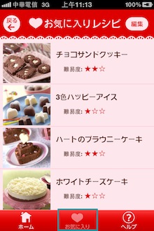 第一次嘗試不要挑太難的好了,凱凱選了一個難易度一顆星的食譜點入。進入後可以看到美美(又讓人流口水)的圖片,往下拉可以看到這款巧克力的介紹。想要加入最愛的話,可以按下右上的「お氣に入りレシピに登錄」,想要刪除就再按一下,所有加入最愛的都可以在畫面下方的「お氣に入」裡瀏覽囉!
